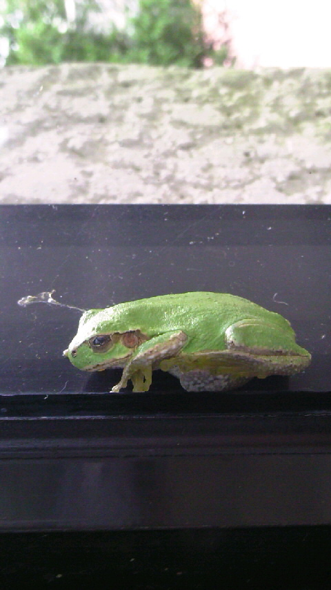 このカエルちゃんはねーよく寮の窓の淵にくっついてるんだよね。