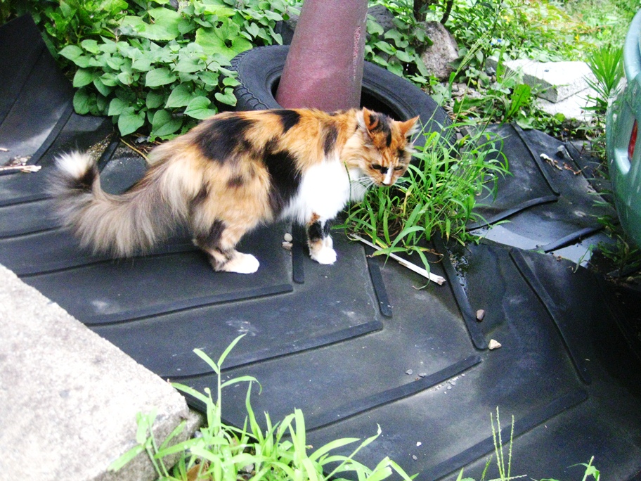 おそらく飼い猫ちゃん。鈴がちりんちりんって鳴ってたよ。模様ときついめつきがステキ!